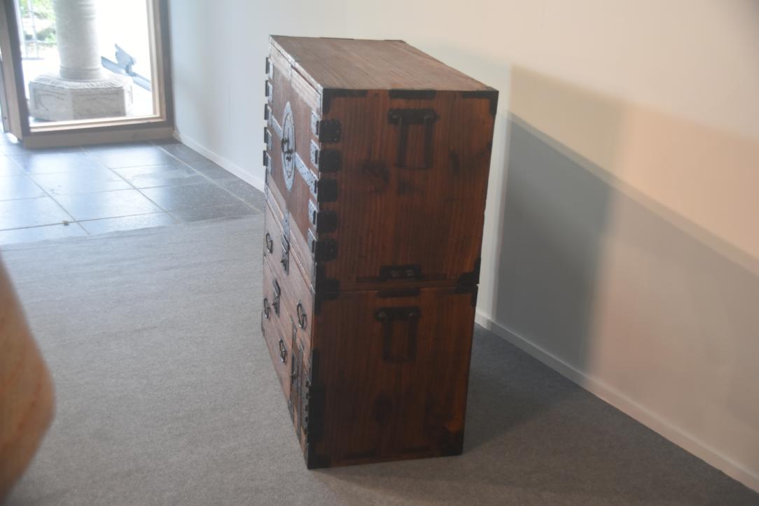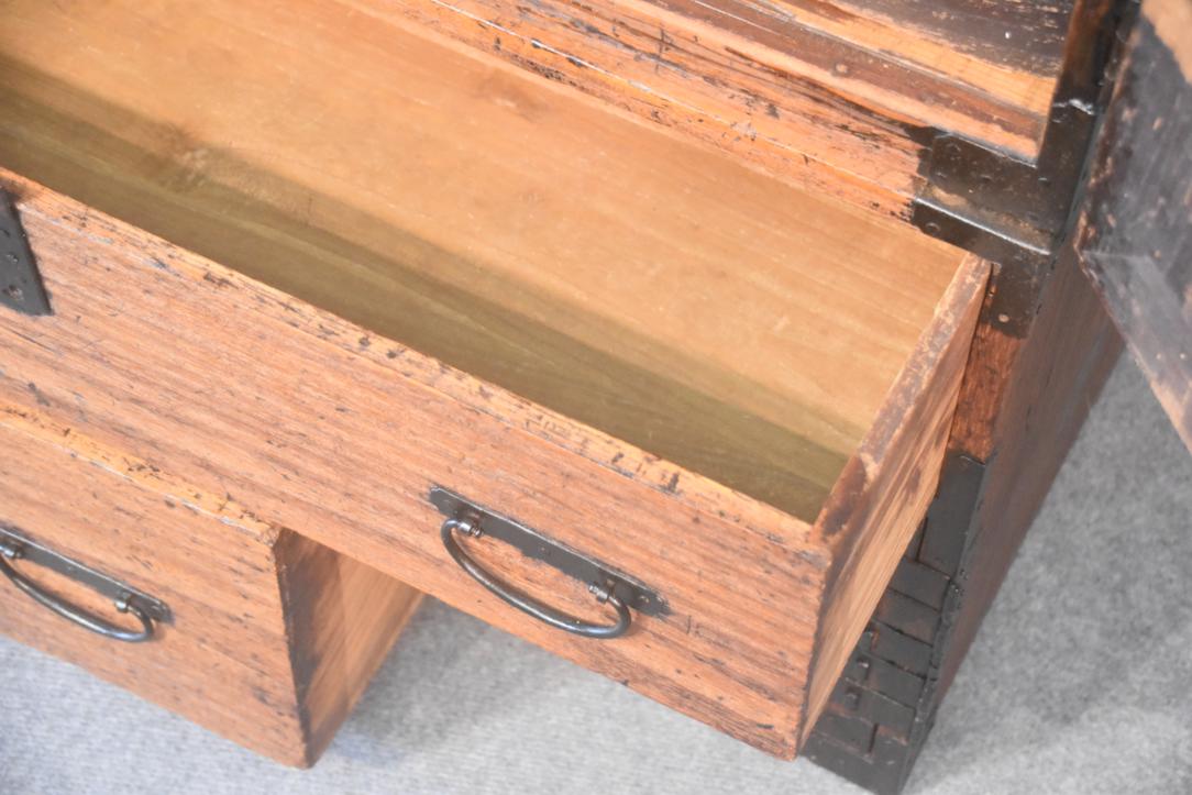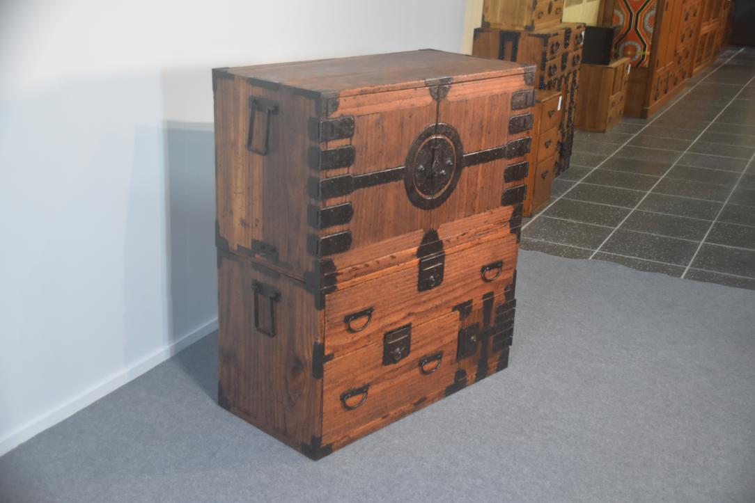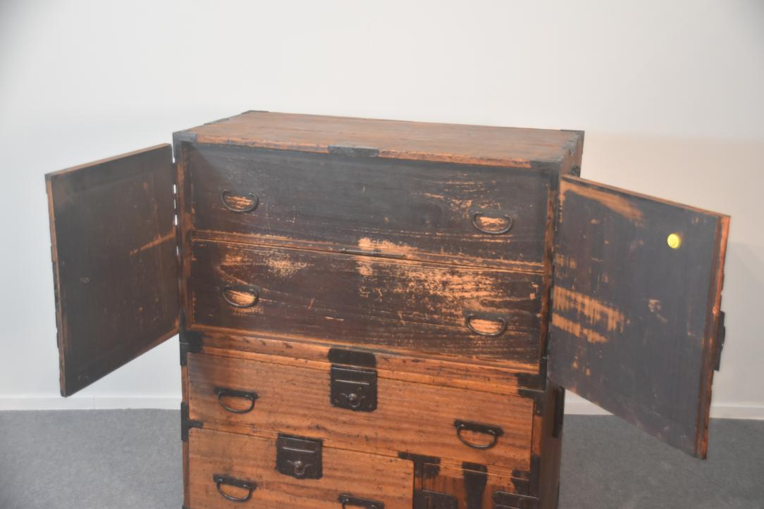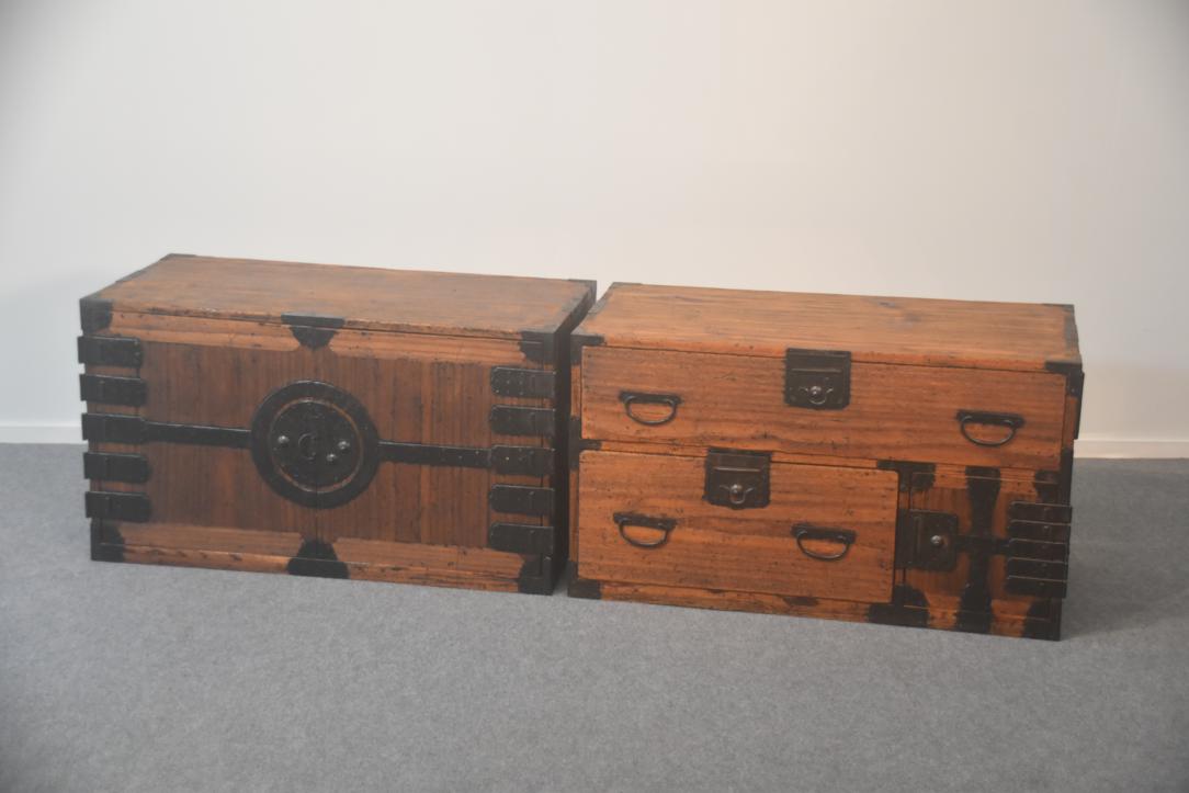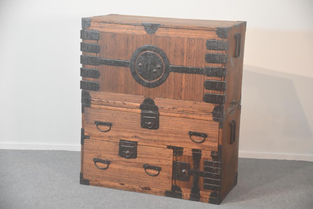 Antique Kannon Biraki clothing chest on chest, crafted from lightweight paulownia wood, circa 1890’s. Featuring double-door upper compartments and multiple drawers below, this Japanese Meiji-era Tansu combines functional elegance with traditional joinery and an aged, warm natural finish. A very versatile two-section chest that can be stacked, used as a bedside chest, placed side by side as a low sideboard, or arranged back to back as a unique coffee table. Functional, flexible, and beautifully crafted.