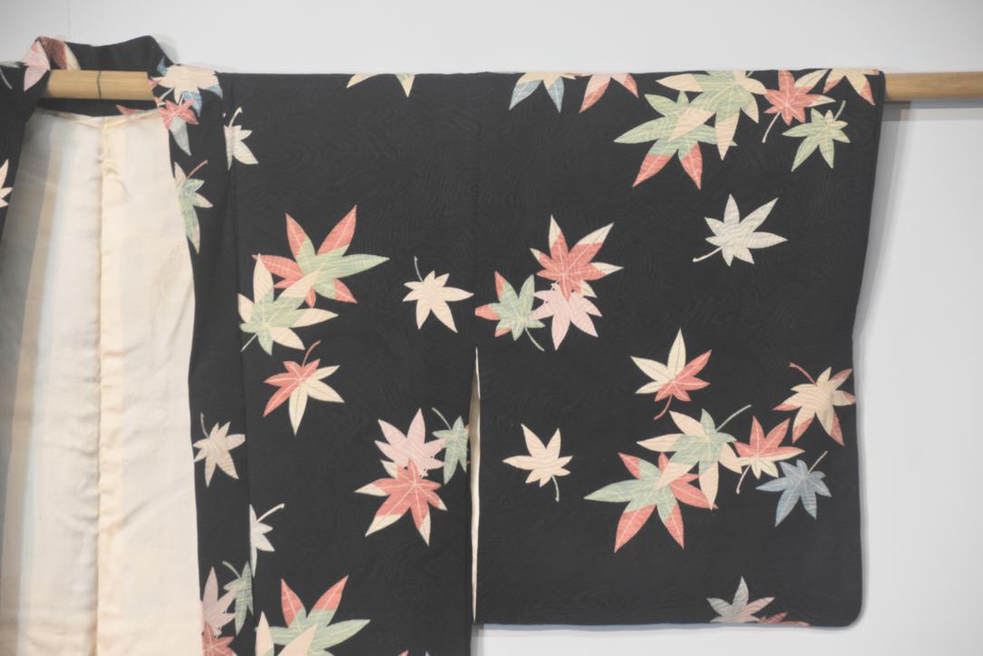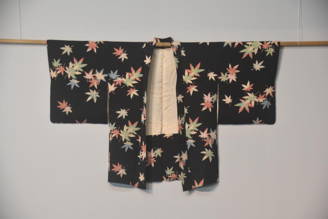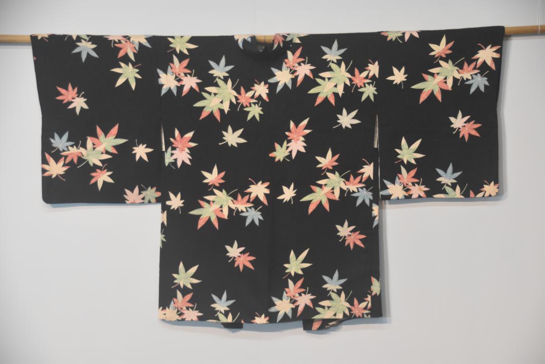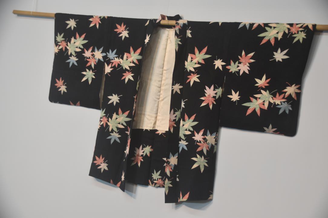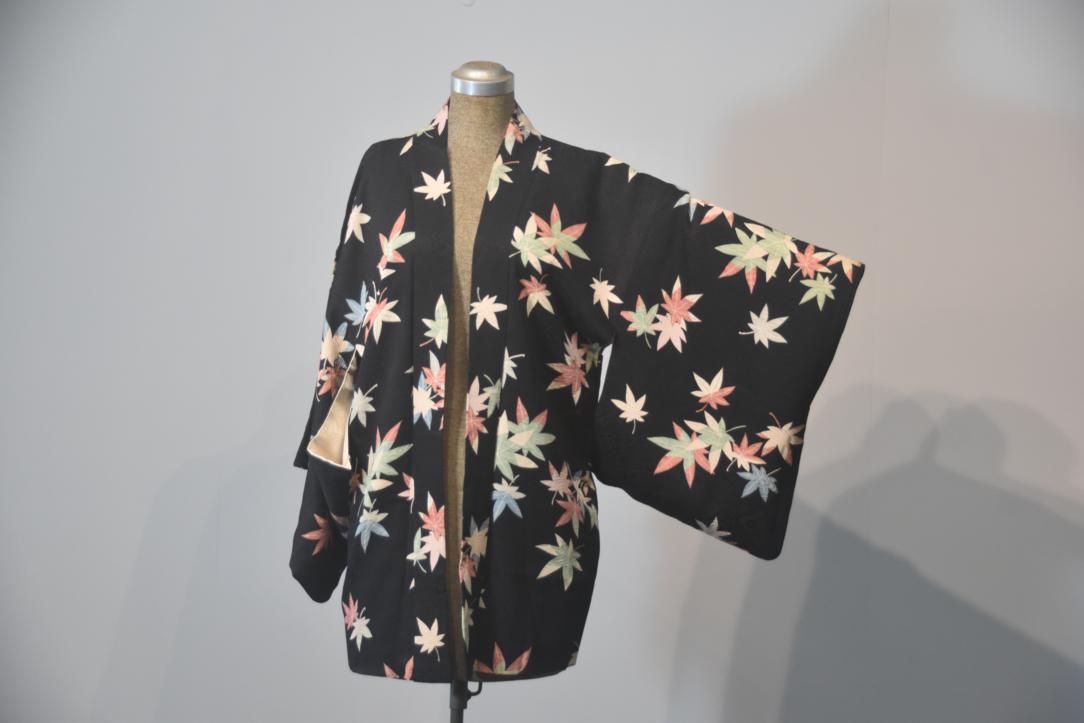 Black Jacquard & Coloured Maple Leaves Silk Vintage Haori Jacket.