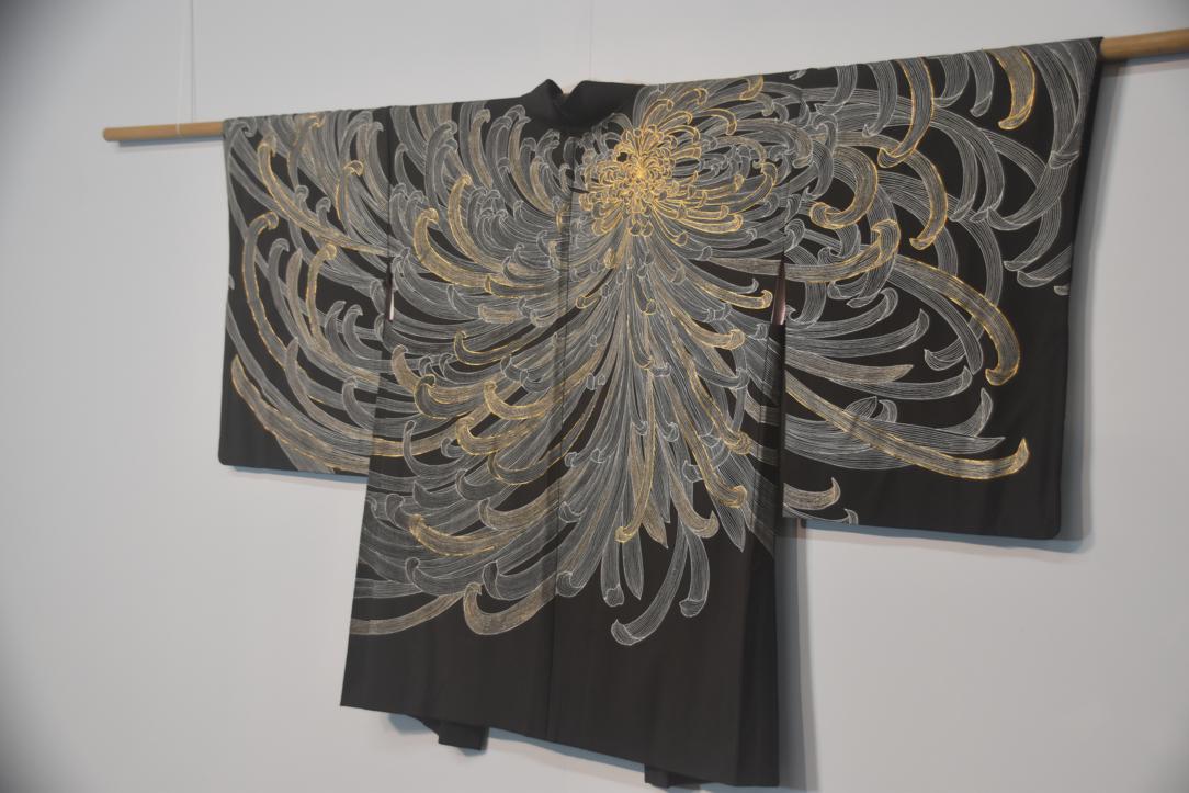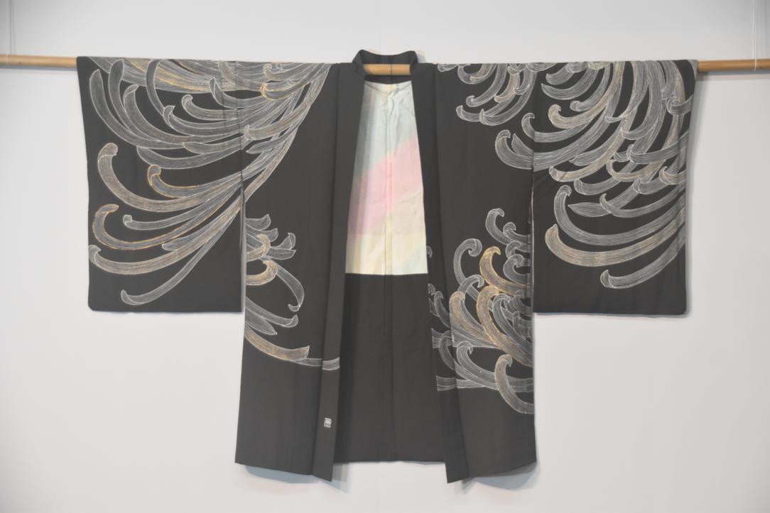 Black silk with dynamic Chrysanthemum metallic thread embroidery in silver and gold. Vintage Japanese Silk Haori Jacket.