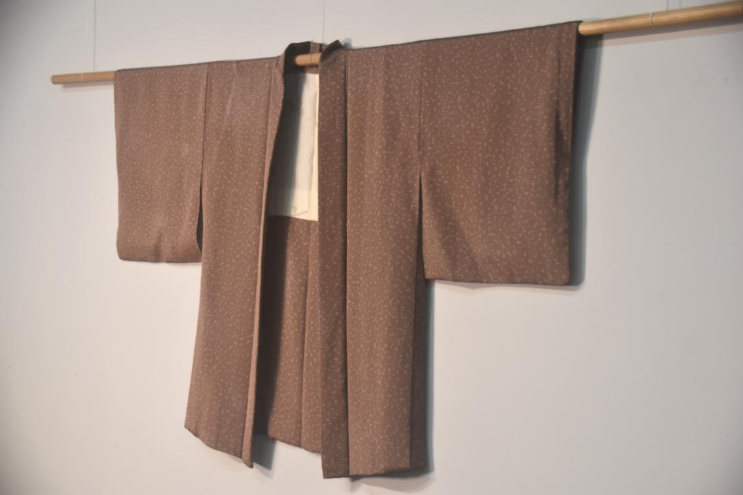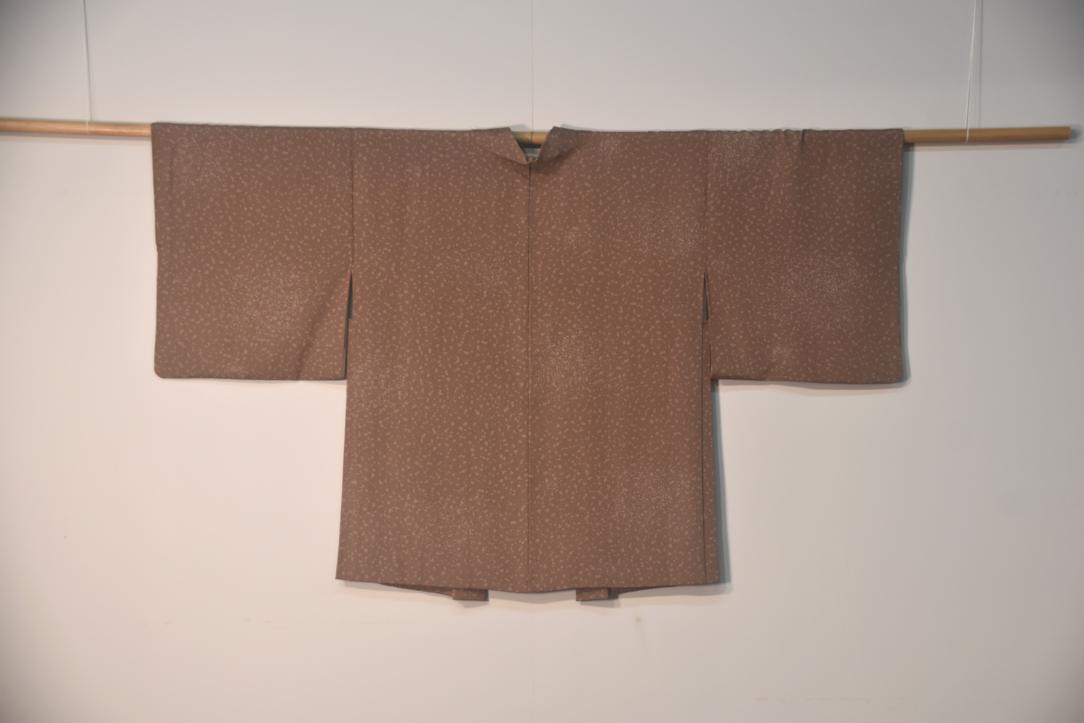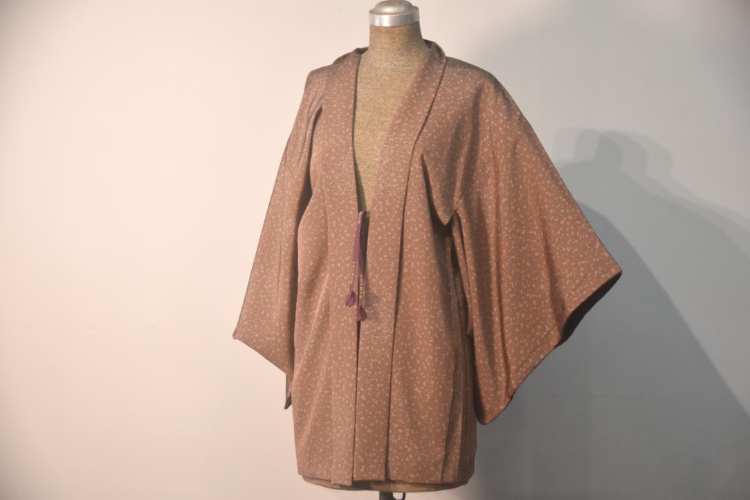 This haori is in a dark coral colour with lighter speckled pattern across the fabric.