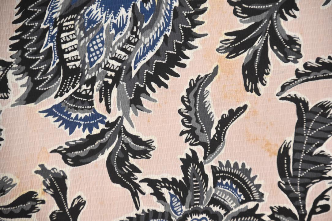 This beautiful haori has a baby pink background with black and blue floral design.