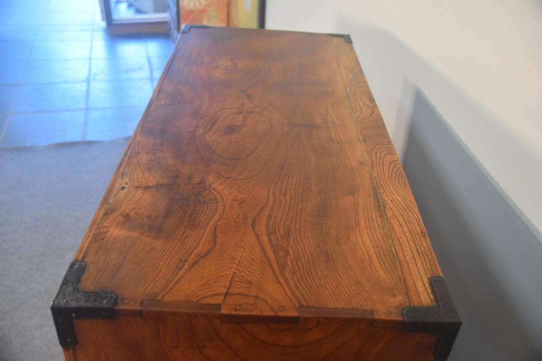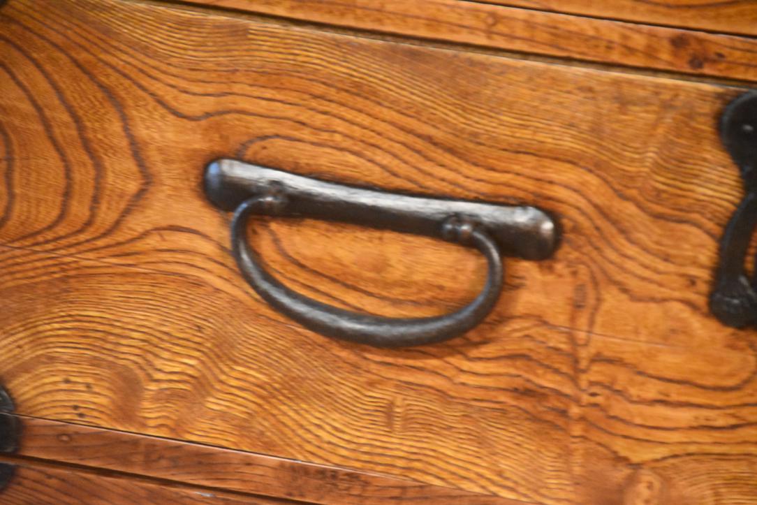Elm Clothing Chest. Japanese clothing chest circa 1900 crafted from solid Keyaki (Japanese Elm) and Sugi Japanese Cedar. Features bold grain, hand-forged iron hardware, and traditional joinery. Exceptionally sturdy with rich patina, reflecting Meiji-era craftsmanship. Ideal for collectors of authentic Japanese antique furniture.
