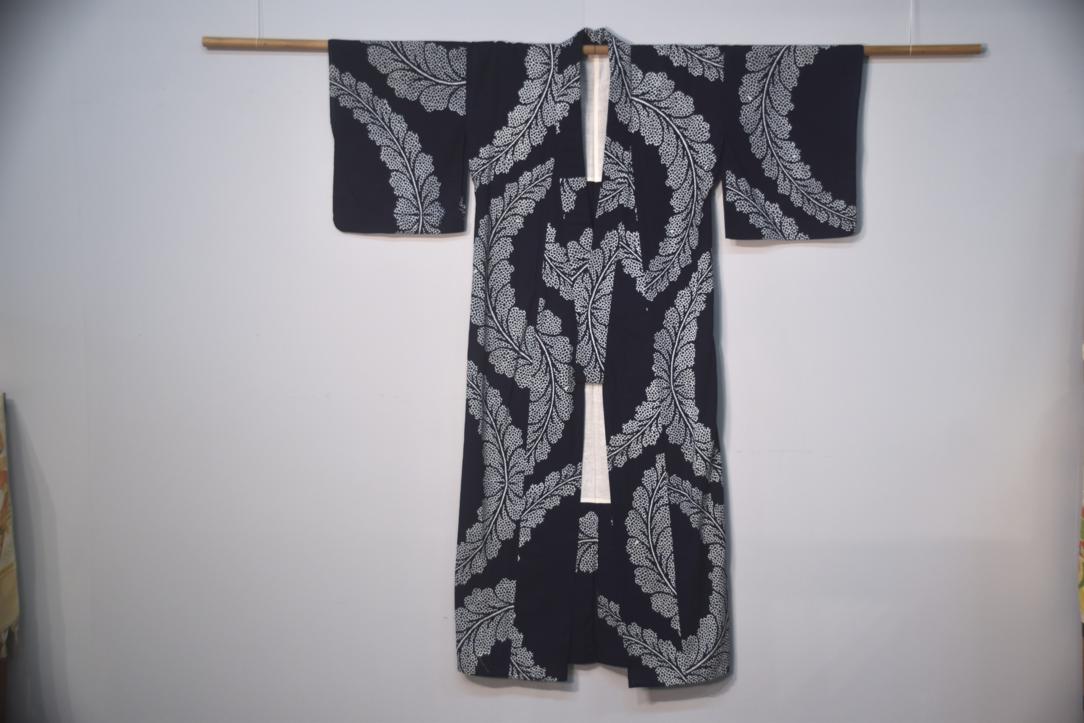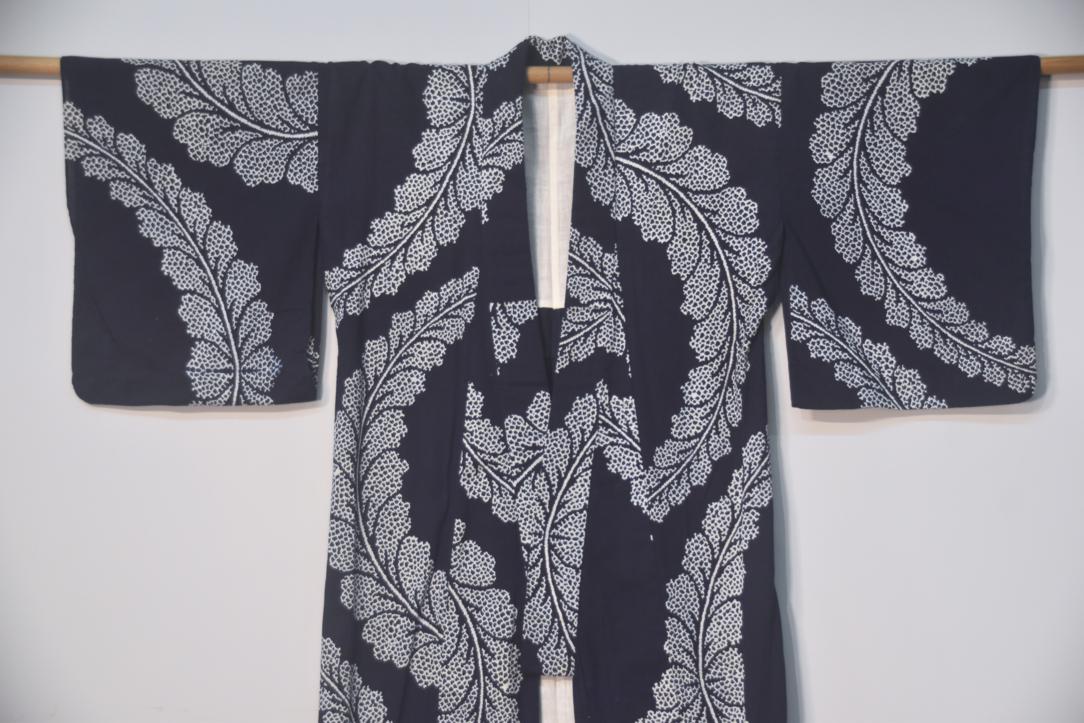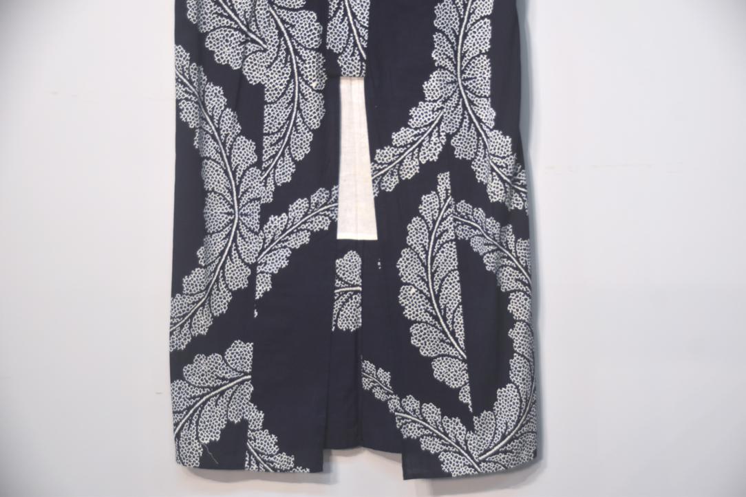 White & Navy Blue Vintage Japanese Cotton Yukata with a dynamic fern leaf design.