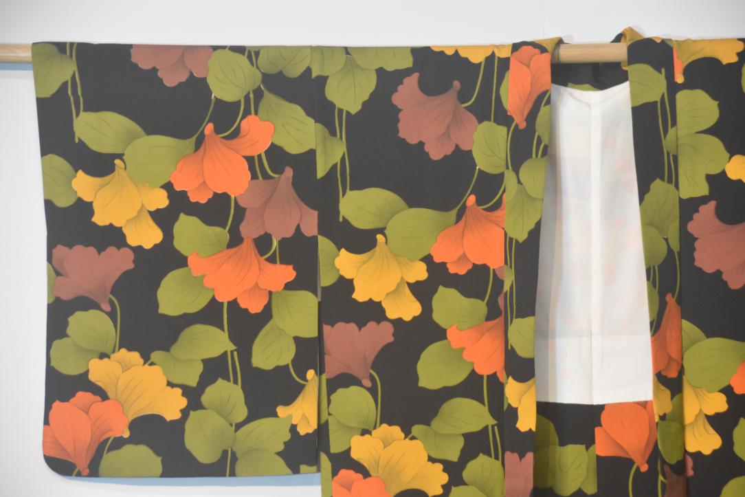 This jacket is a soft flowing black with gorgeous floral design with olive green, orange and ochre.