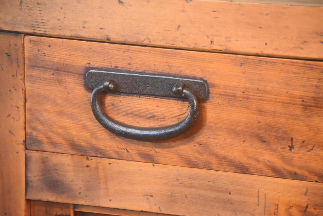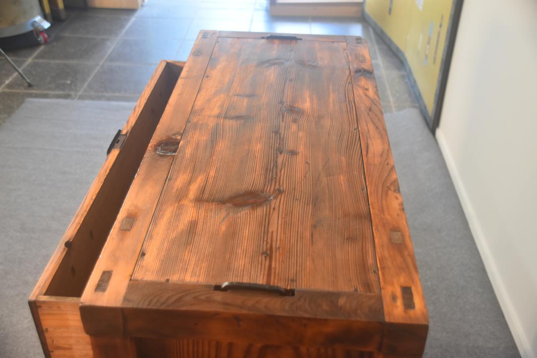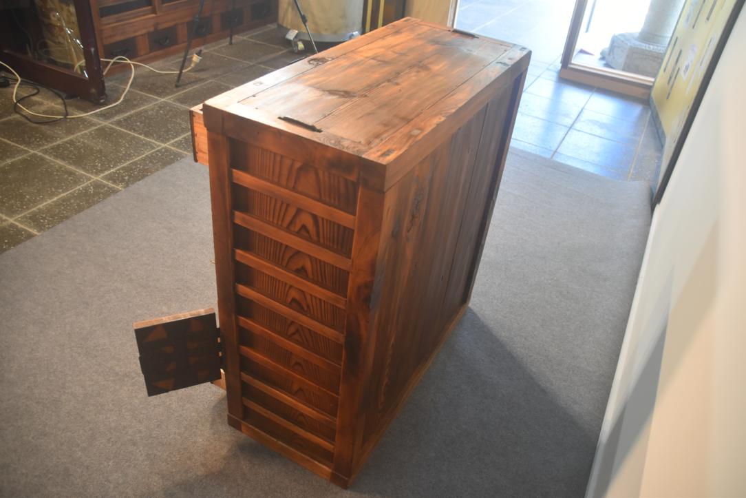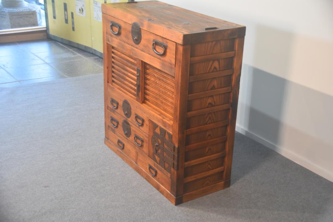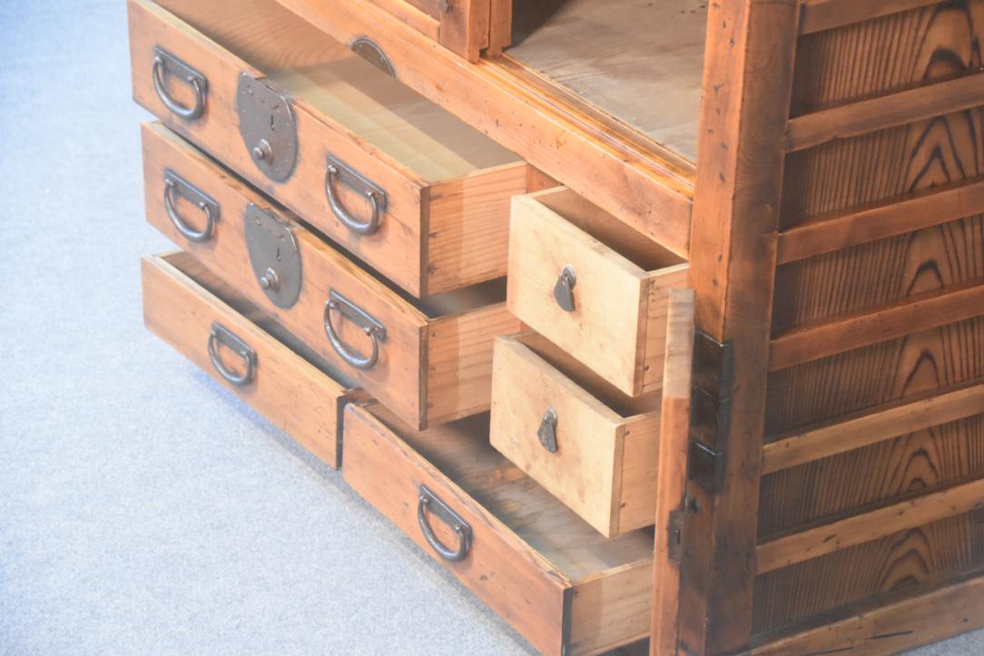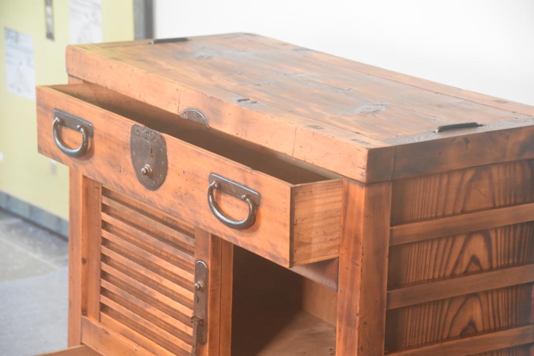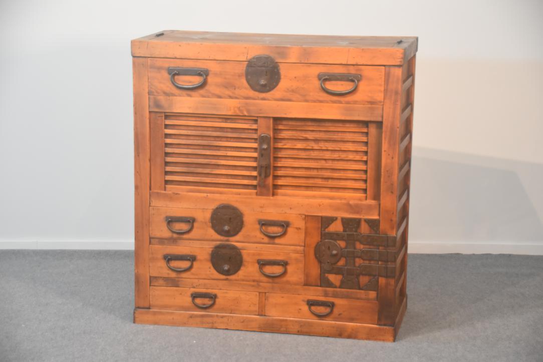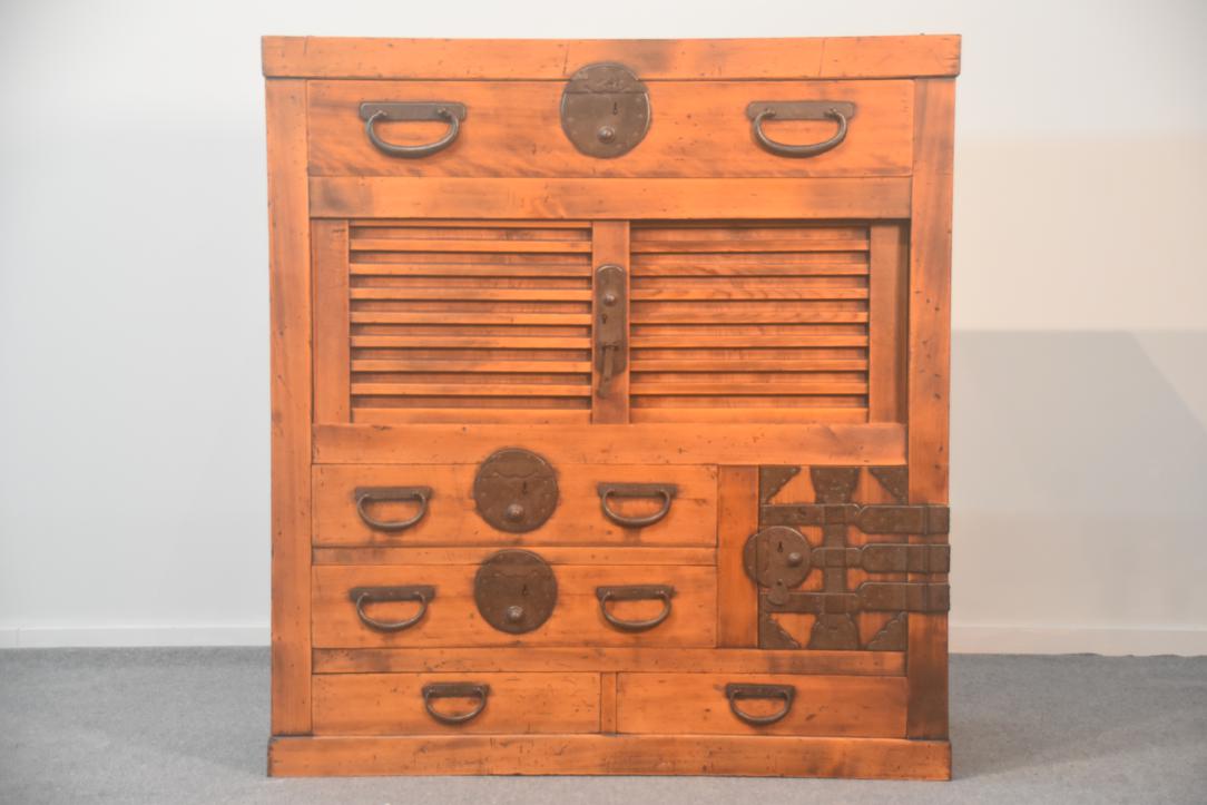 This antique Choba Dansu merchant chest from Japan’s Gifu region features hand-forged iron hardware and is crafted from hinoki and sugi woods. Custom-designed to reflect the original owner’s taste and wealth, it embodies refined Meiji period craftsmanship.