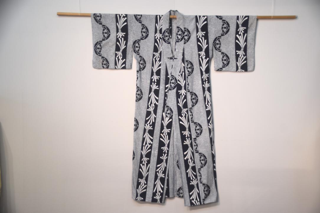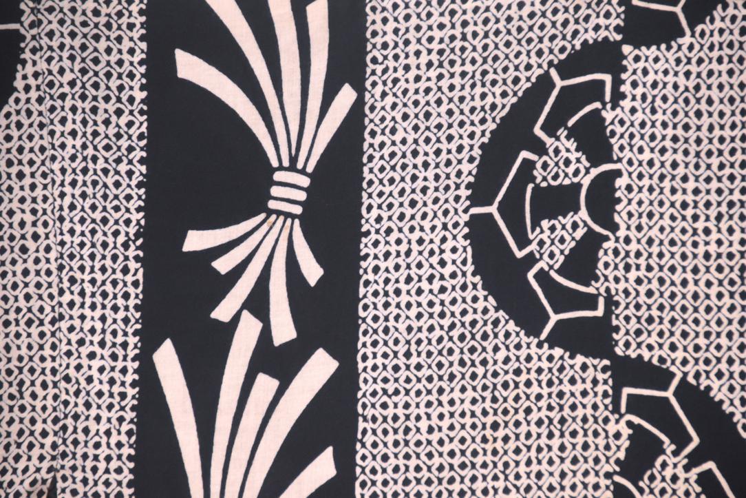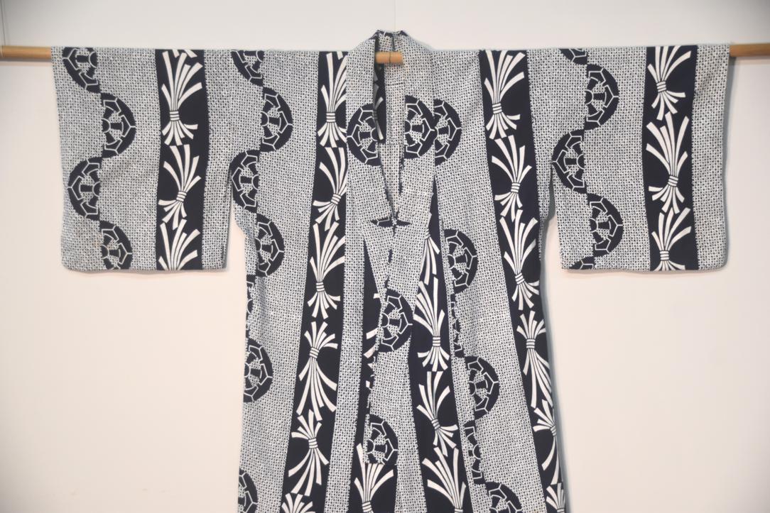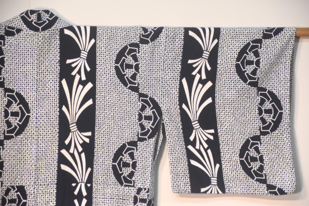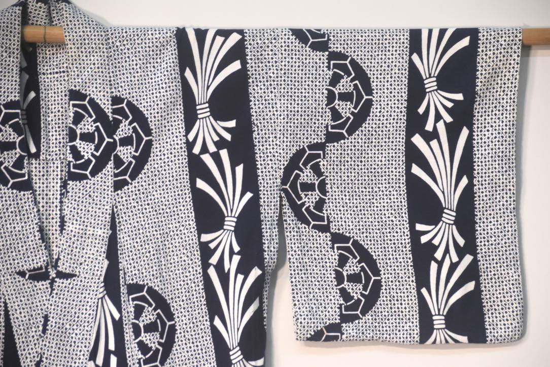 White & Darkest Navy Blue Vintage Japanese Cotton Yukata with a dynamic harvest design.
