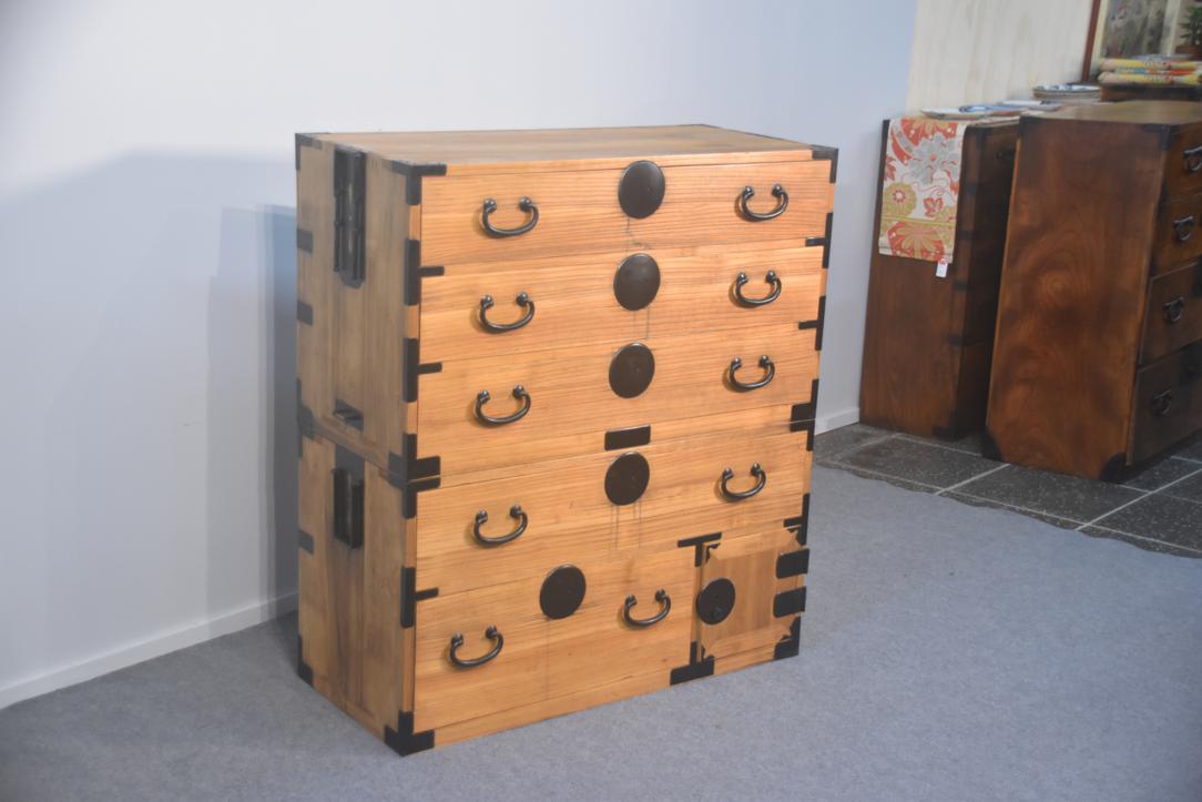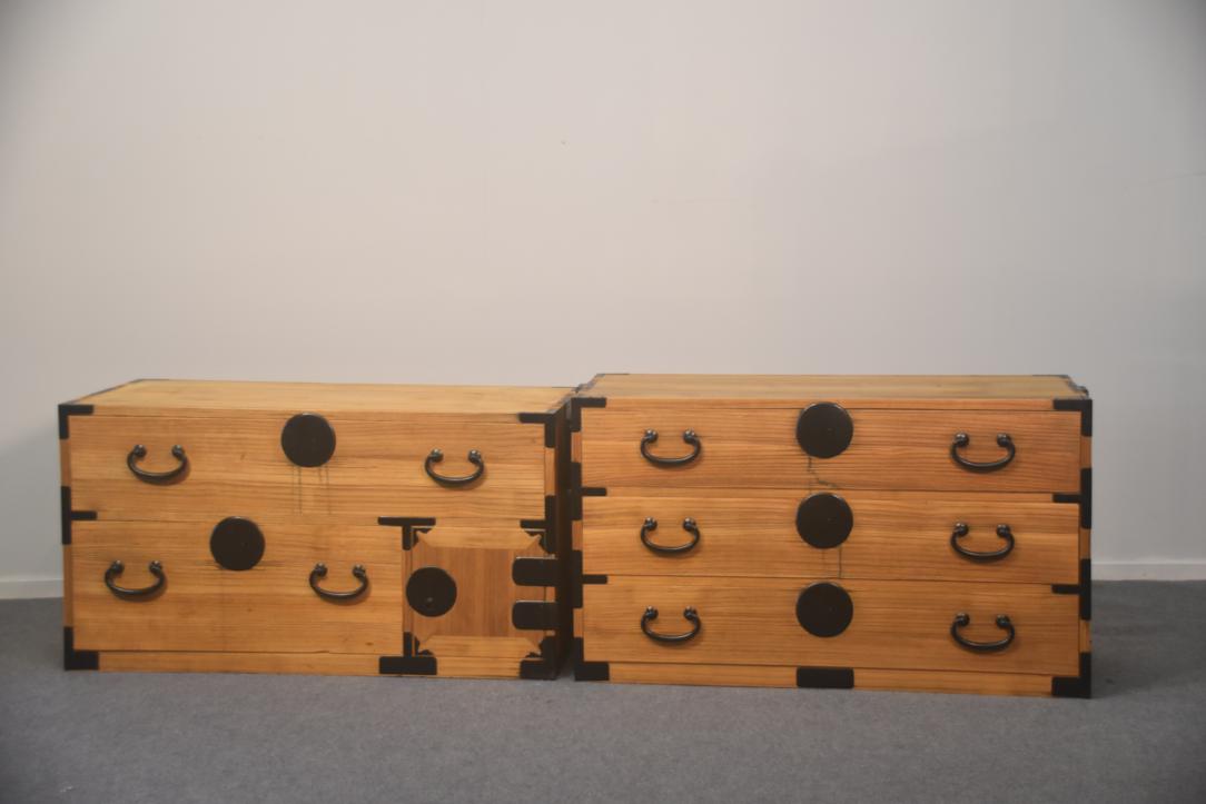 Japanese Antique Clothing Chest. Japanese Antique 2 Section Clothing Chest. Japanese chest on chest with black lock plates, crafted from kiri (paulownia) The two separate sections can be displayed stacked or placed side by side, creating a beautiful low sideboard with practical storage and classic Meiji-era inspired design.