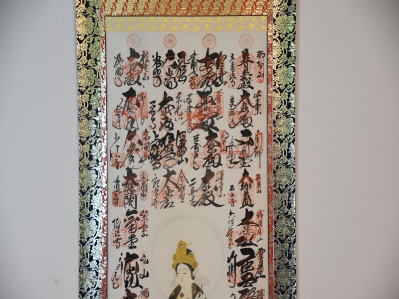 The central figure is the Goddess of Mercy and she is surrounded by the stamps of each temple the owner has visited on his or her pilgrimage. In great condition. 590 mm’s wide and 1980 mm’s long.