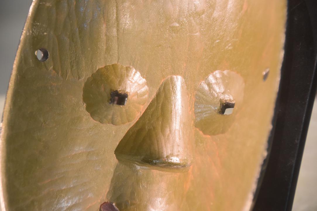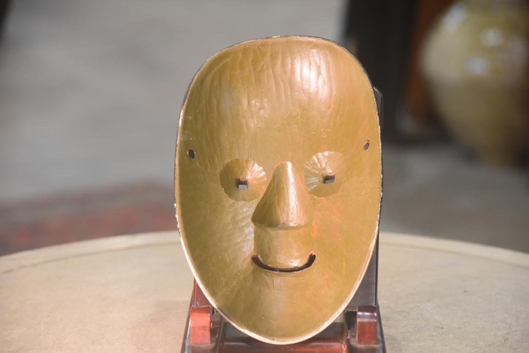A captivating Japanese wooden Noh mask, circa 1950, hand-carved with expressive detail.