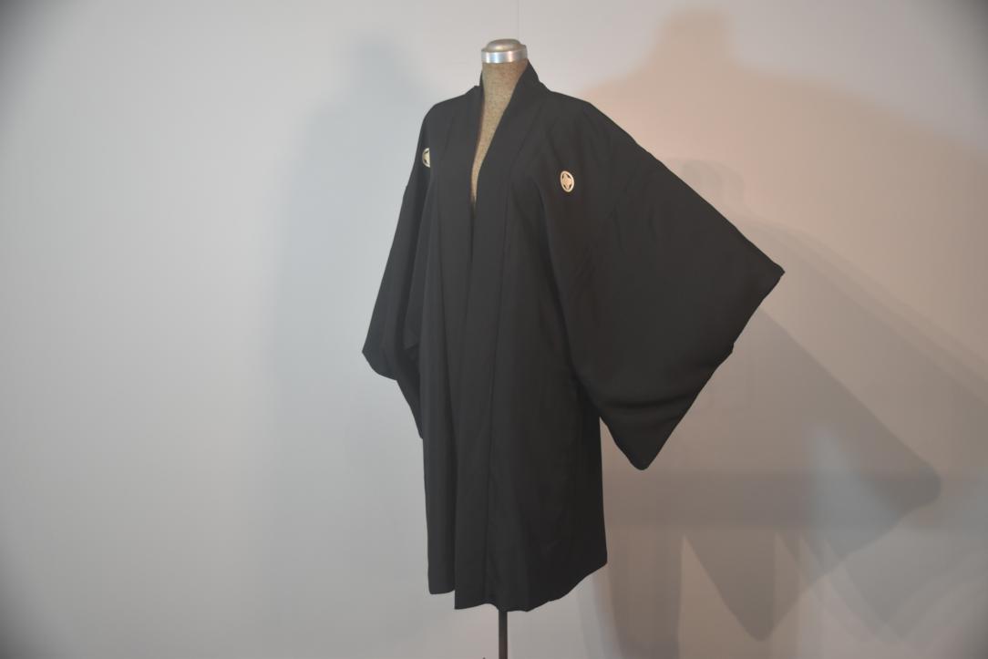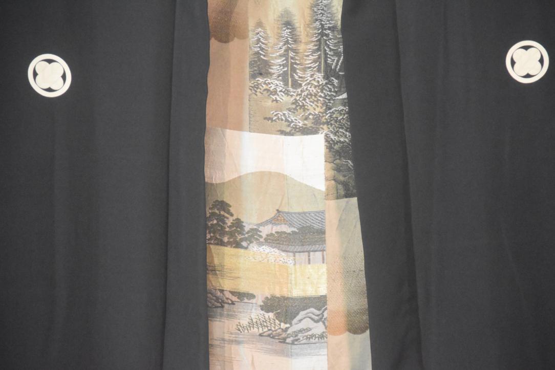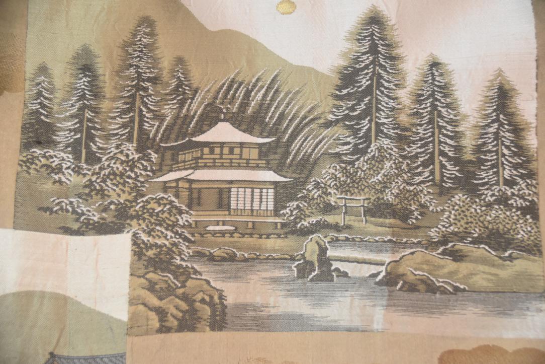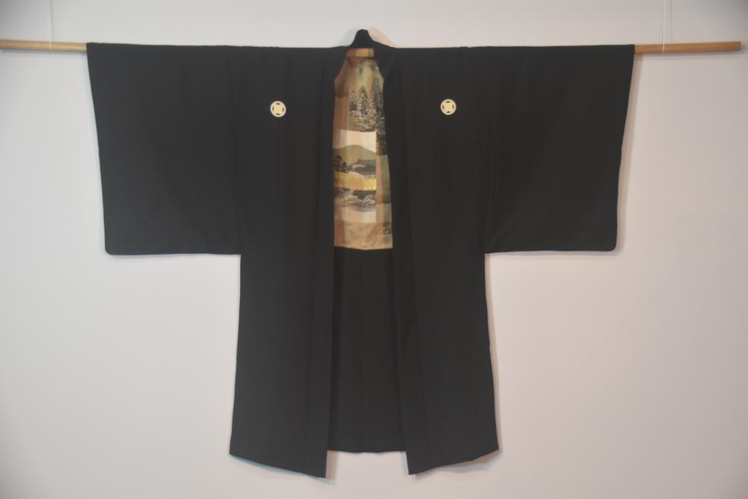 Mans Silk Vintage Haori Jacket with brocade lining featuring Japanese Lake House scenery design.