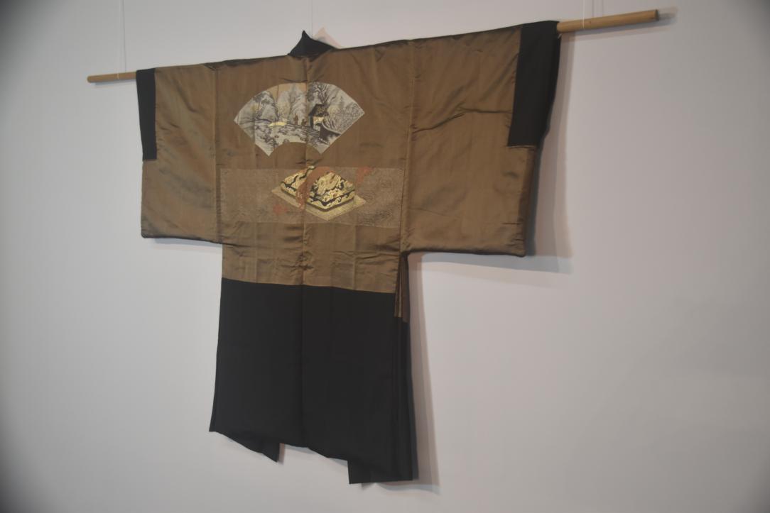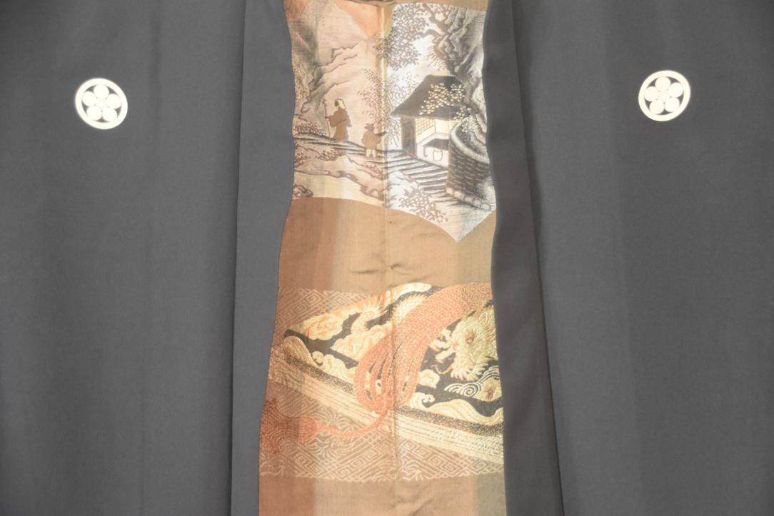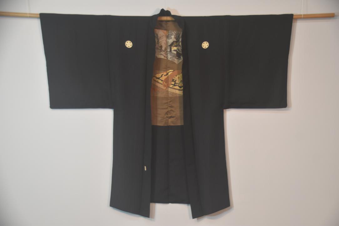 Mans Silk Vintage Haori Jacket with brocade lining featuring Japanese Sage and Tea House scenery design.