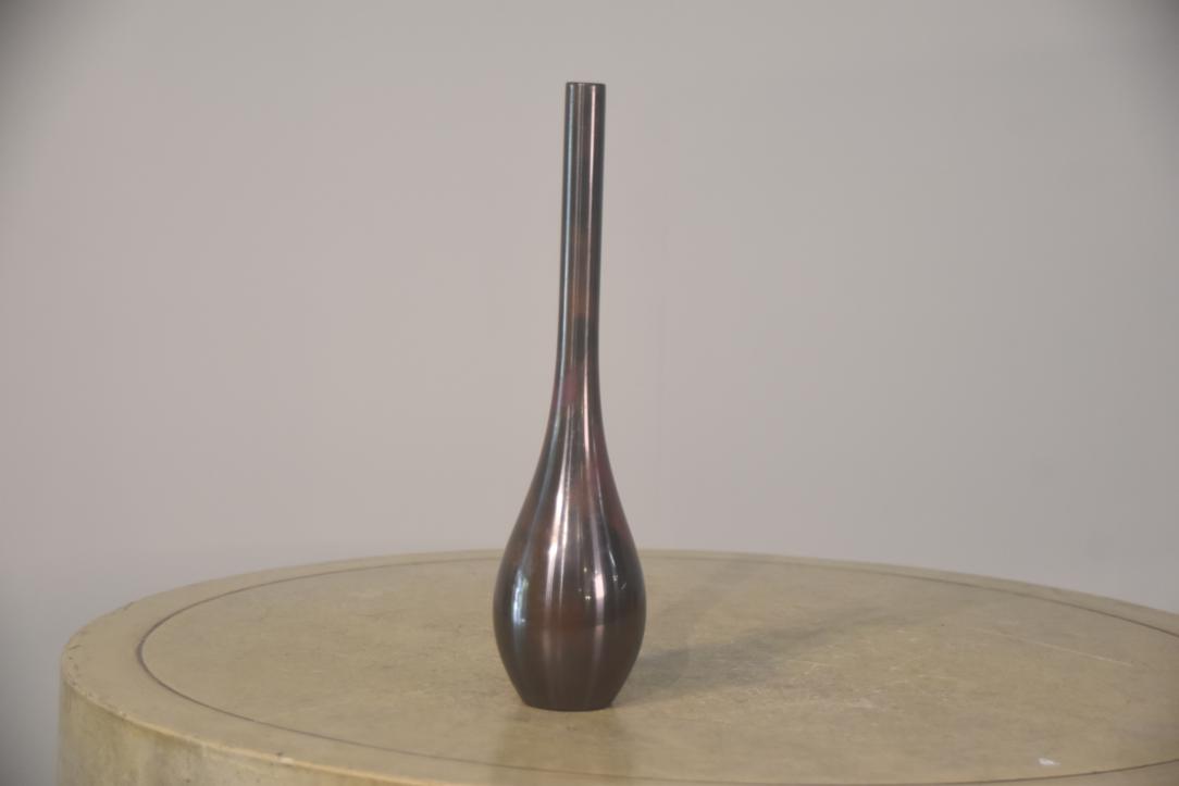 The Murashido(斑紫銅) patina is a traditional Japanese bronze finishing technique known for producing richly mottled, multicolored surfaces—often in tones of copper, purple, gold, green, or brown. The name “murashi” implies irregular spotting or clouding, contributing to its painterly, organic beauty.