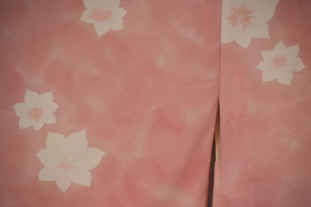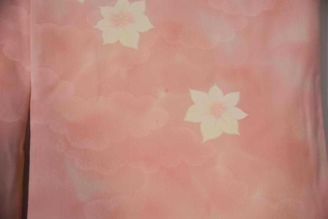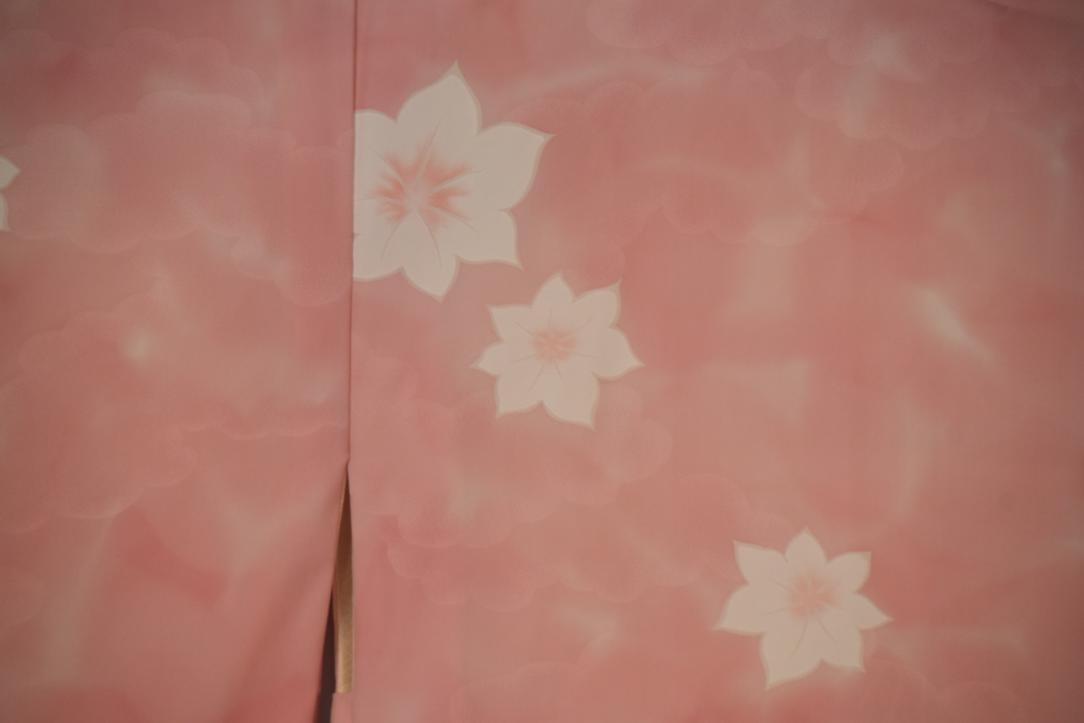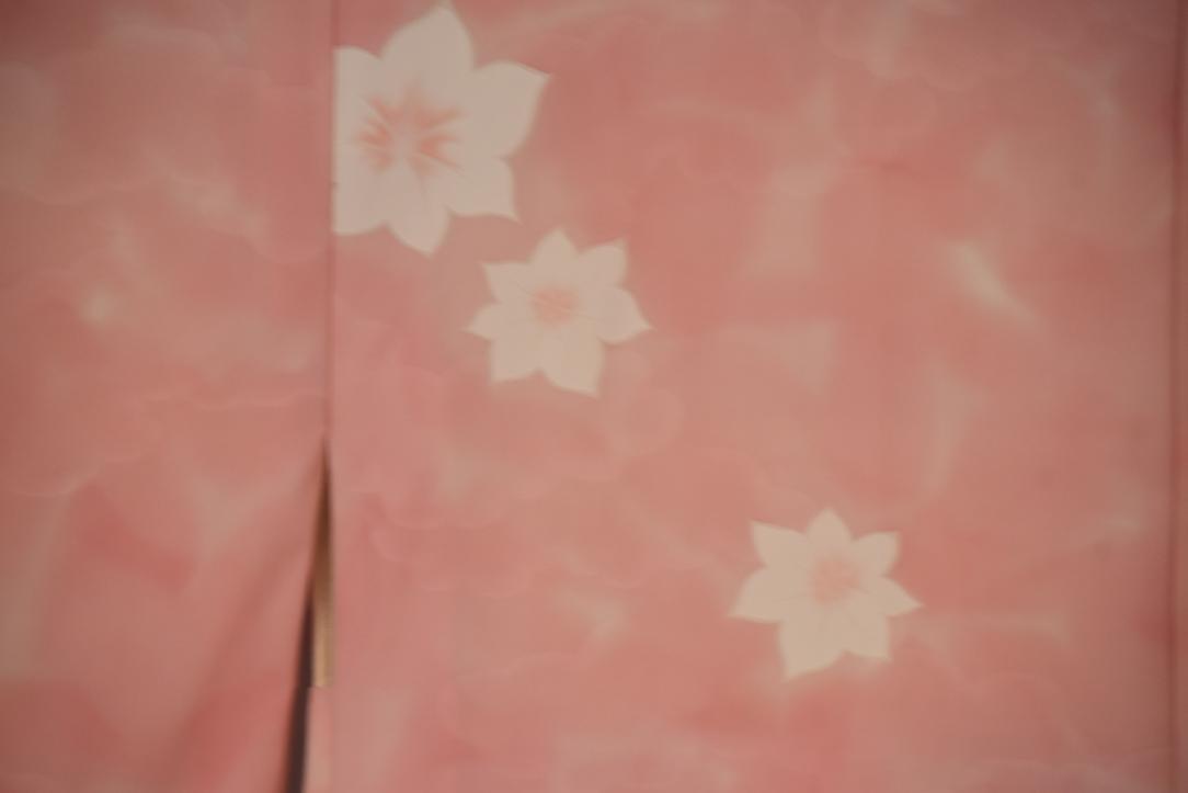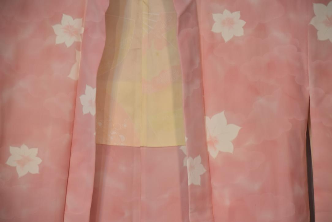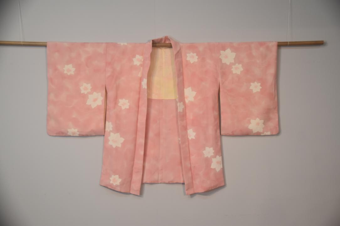 This silk damask haori features pink and white floral design. There is a small mark on the front left sleeve as shown in photos.