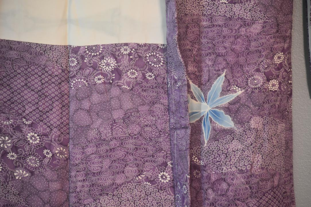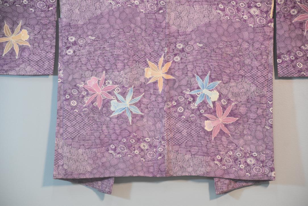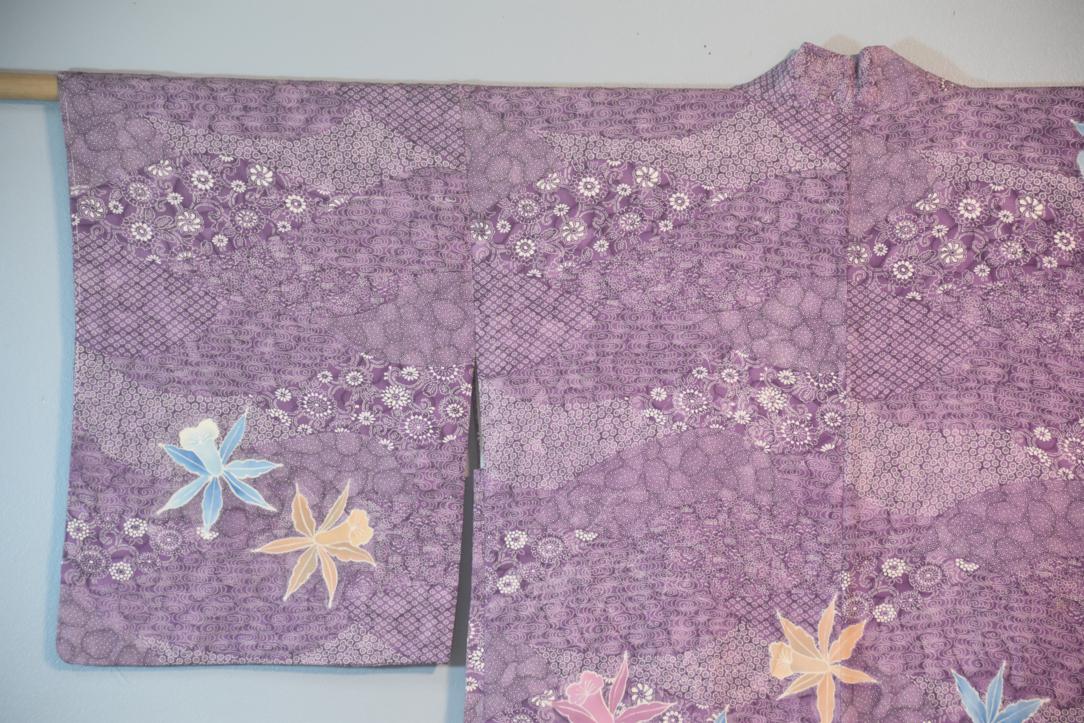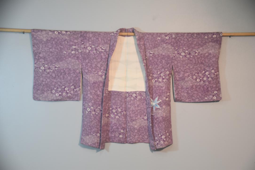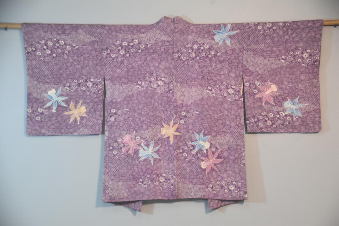 Vintage Japanese Haori Jacket in purple featuring orchid flower design.
