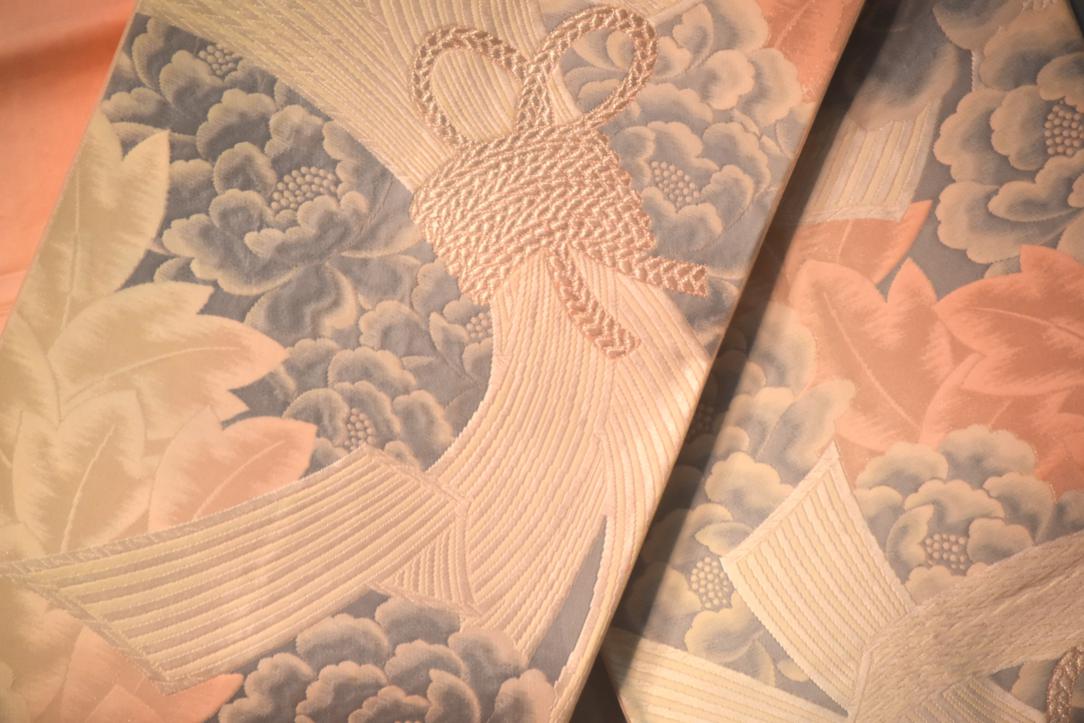One side of this Obi is heavy embroidery and the other side shows a plain pearl pink underside.